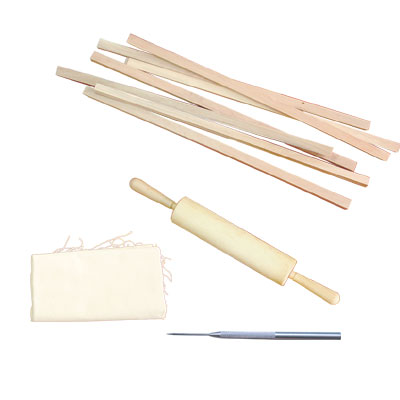 1 slab roller 4 pair of clay strips a potter needle 3 pieces of 24"x24" rolling canvas |