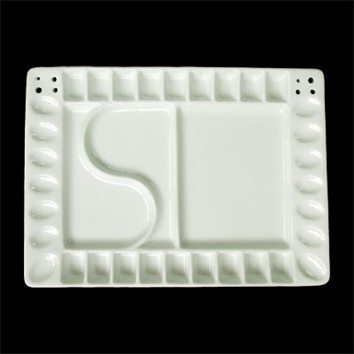 -Heavyweight for the studio, will not slide around during use. -18 rectangle wells and 14 oval wells for colour and 3 large mixing ares. -Large palstic cover for extra mixing area and better storage. -Corner holes to hold 8 brushes. -Porcelain surface makes cleanup a snap. |