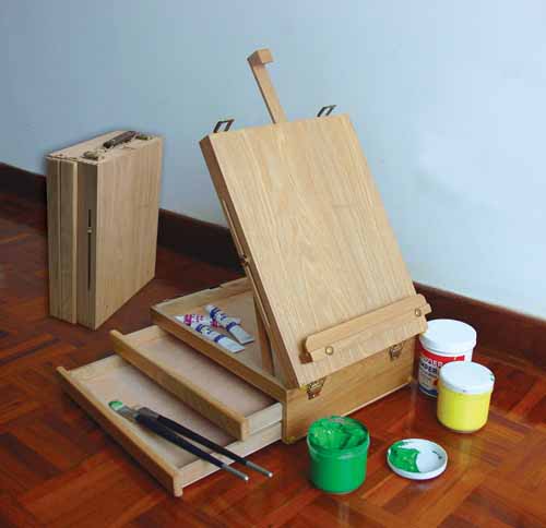 adjusted flat for water color paining, at a slight angle for drawing, at a vertical position for oil and acrylic painting and slightly forward for pastel painting. Use any size canvas or paper pad up to 25-1/2" high. The handy compact table easel box, features 2 extra drawers, which can store all small painting supplies, like canvas panel, canvas pad, paint palette, paints, small tools etc.,The 2 drawers can also work as shel help. When this box easel is closed, it become a space saving neat square box. Very convenient for carrying and storing: |