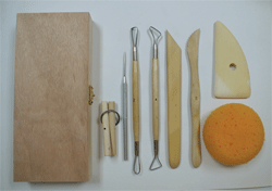 8 tools in a wooden box, including loop tool, ribbon tool, potter's rib, needle sponge, scraper, and wire clay cutter. These are basic pottery tools for the beginner and professional. | |