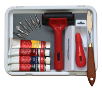 *4pc 22ml Printing Ink(color include: black, red, yellow, blue) *6 Lino Cutters and 1 Handle *1pc Baren Dia. 4'' *1pc Box For Lino Cutters & Handle *1pc ''Breeze Cut" Lino Block 6" x 8'' *1pc Hard Rubber Brayer Dia. 1'' Width: 4'' |