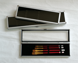 ABB03 11''Lx2-1/4''Wx 1''H For short handle brushes Such beautiful aluminum brush boxes with a clear top and black velvet liner give brushes best presentation. 2 black elastic bands help to keep the different-size brushes in position. These boxes are ideal for storing and transporting valuable brushes. Or functions as a precious gift package. |