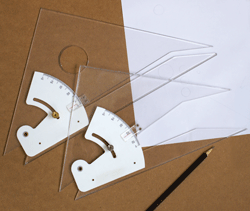This triangle is made of heavy, clear acrylic plastic. It's accurately divided from 0กใ to 90กใ in half-degrees. Die-engraved graduations for high visibility. The metal thumbscrew securely holds the selected angle and allows quick pickup and manipulation. Available in 10" & 12", both with inking edge. | |