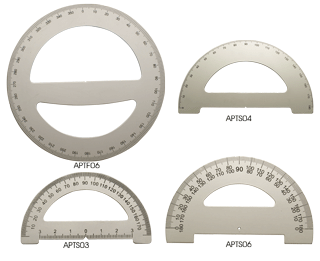 Item#APTS03 Straight segment offers a straight edge ruler, 7.5cm in diameter. Item#APTS04 Measures 10cm in diameter, with double stamped graduations in 1¡ã increments. Item#APTS06 Measures 15cm in diameter.This Full Circle Protractor, measures 6" in diameter. Its crossbeam is about 1" thick. It is precisely divided into half degrees, from 0¡ãto 360¡ã. Item#APTF06 |