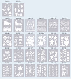 from 0.2mm thinness durable and flexible PVC that will last for years of creative use. With various of fun graphics like natural creature, buildings, lettering and patterns, they are suitable for many different needs such as drafting, designing, advertising, kid's art projects and even air brush painting. Each measures 8" กม 10". |