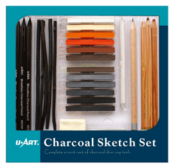 Set includes: 12 earthtone drawing sticks, 1 pc each of white/ sanguine / sepia pastel pencils, 1 sketch pencil, 3 woodless charcoal pencils, 5 natural charcoal sticks, 1paper stomp,1chamois, 1 kneadable eraser, 1pencil sharpener. | |