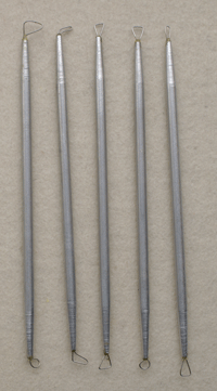 This assortment of durable, double-ended ribbon and wire tools offers a detail modelling possibilities. Set of 5 tools for making thin lines, each has two different ends for a total of ten shapes. Both ends can be used to sculpt and smooth clay. Great for cutting and slicing as well as removing amounts of clay. Each approximately 6" in length. | |