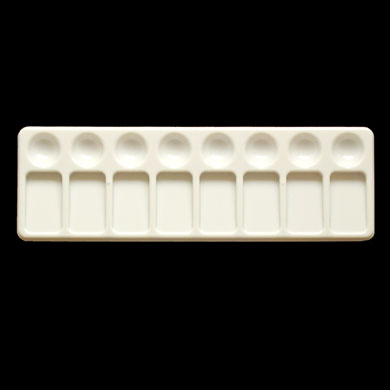 Made of white plasti, has 8 round well for paint and 8 rectangular well for mixing.