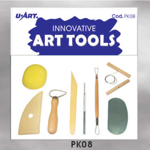 Contains 8 basic tools, includes: boxwood, pottery tool, ribbon tool, potter's needle, loop tool, ribs, steel scraper, clay cutter and sponge. |